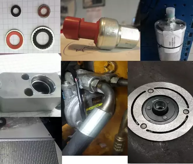 - Fittings o tuercas sueltas que conectan las mangueras con el condensador, compresor, evaporador, filtro, etc. Orings dañados.